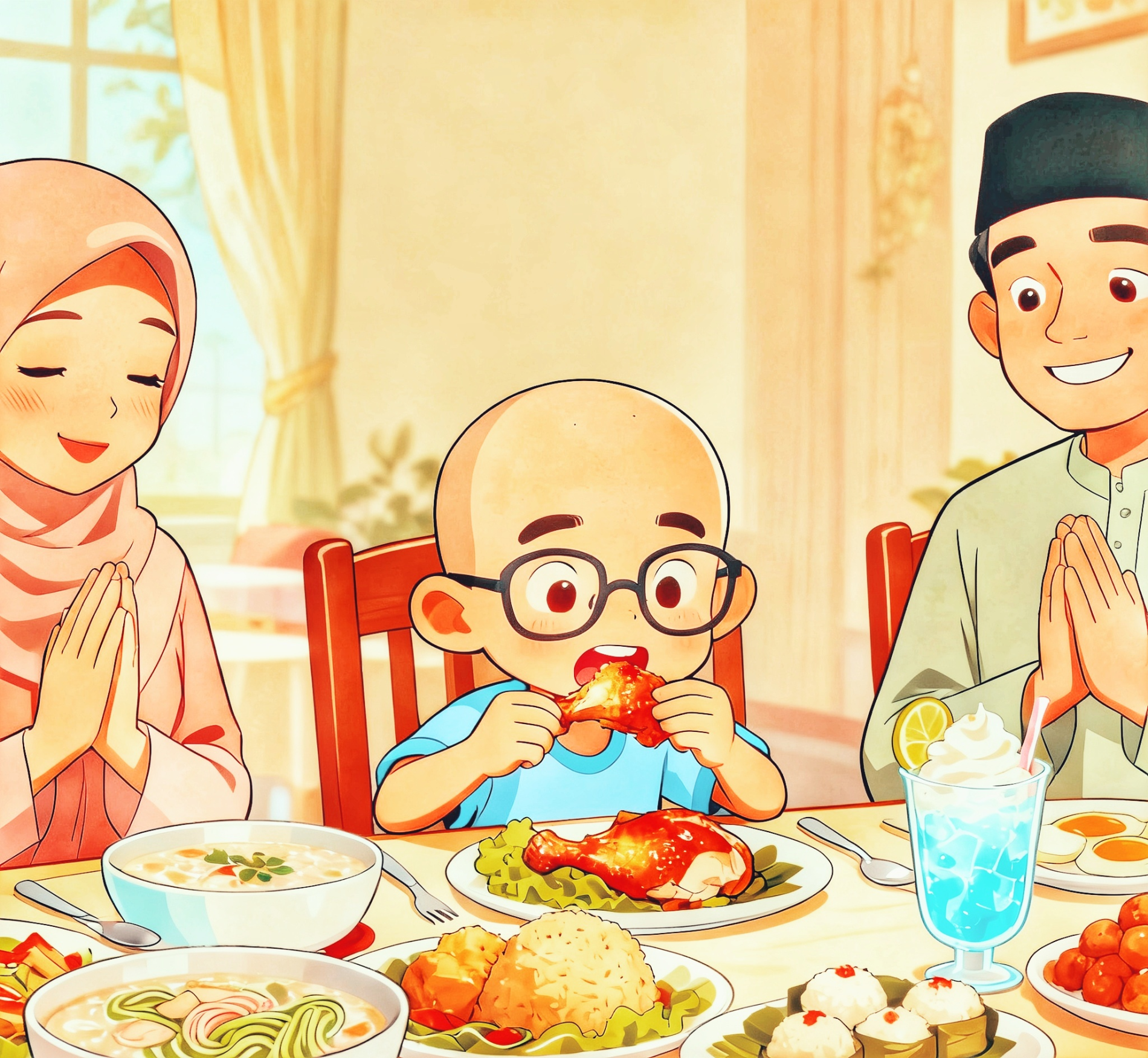 Pagi pertama di bulan Ramadan, Adit terbangun lebih awal dari biasanya. Ia langsung bergegas ke dapur dan melihat ibunya sedang menata hidangan sahur di meja makan yang sudah rapi, Aroma masakan memenuhi ruangan.