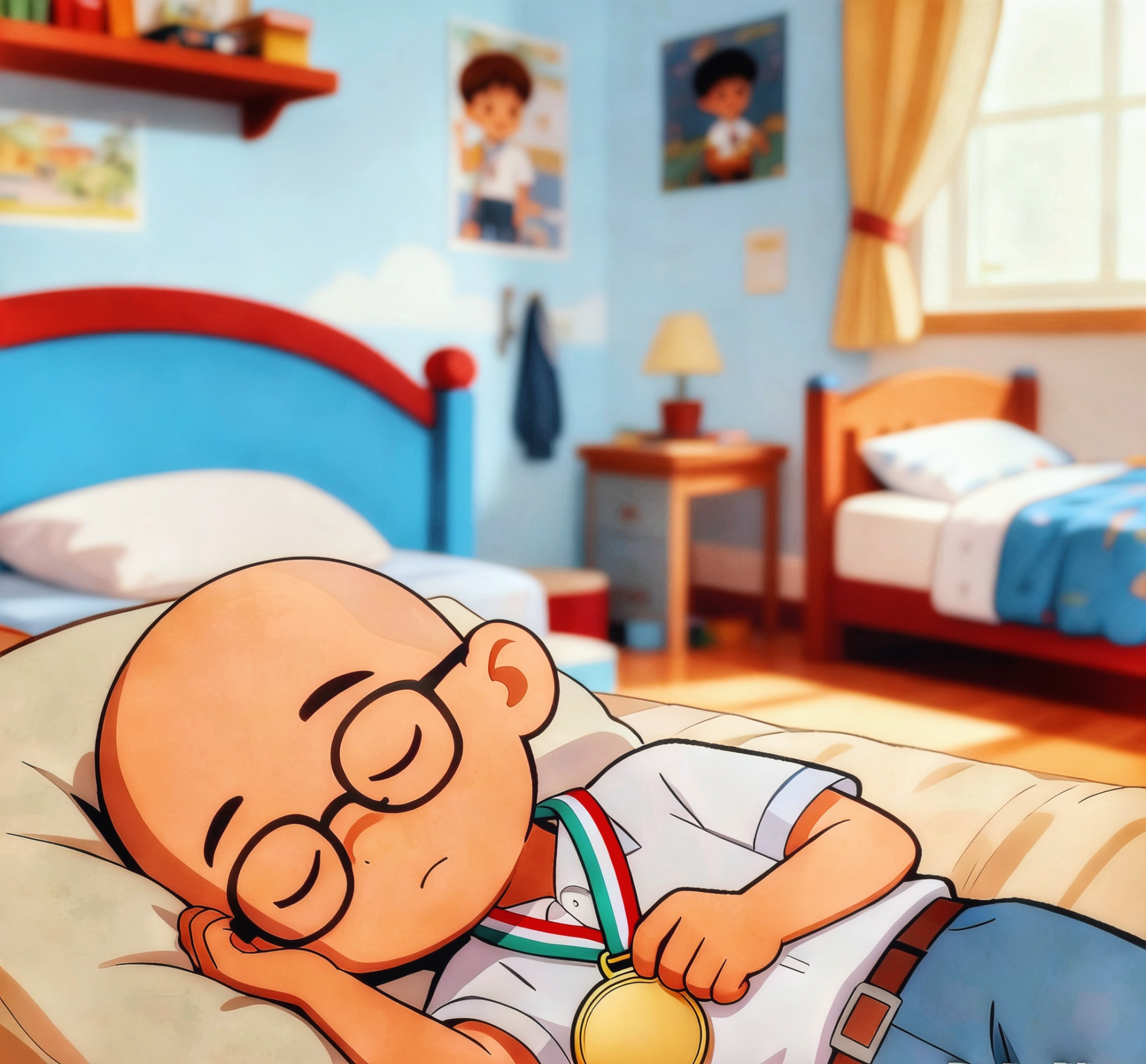 Sambil memegang medali kecil bertuliskan "Pahlawan Puasa" yang diberikan Pak Guru, Adit tertidur dengan lelap.