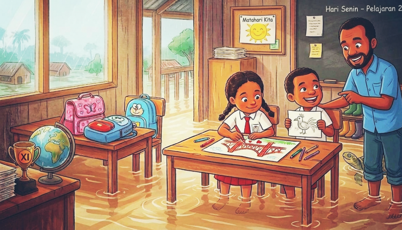 Kogoya menunjukkan hasil karyanya yang bergambar matahari besar dengan senyum lebar kepada Wenda. "Kalau matahari ciptaanku ini muncul, pasti airnya cepat surut dan kelas kita kering lagi," ucapnya dengan penuh percaya diri. Ia memegang kertas itu tinggi-tinggi agar Pak Guru yang berdiri di samping mereka bisa melihatnya dengan jelas.